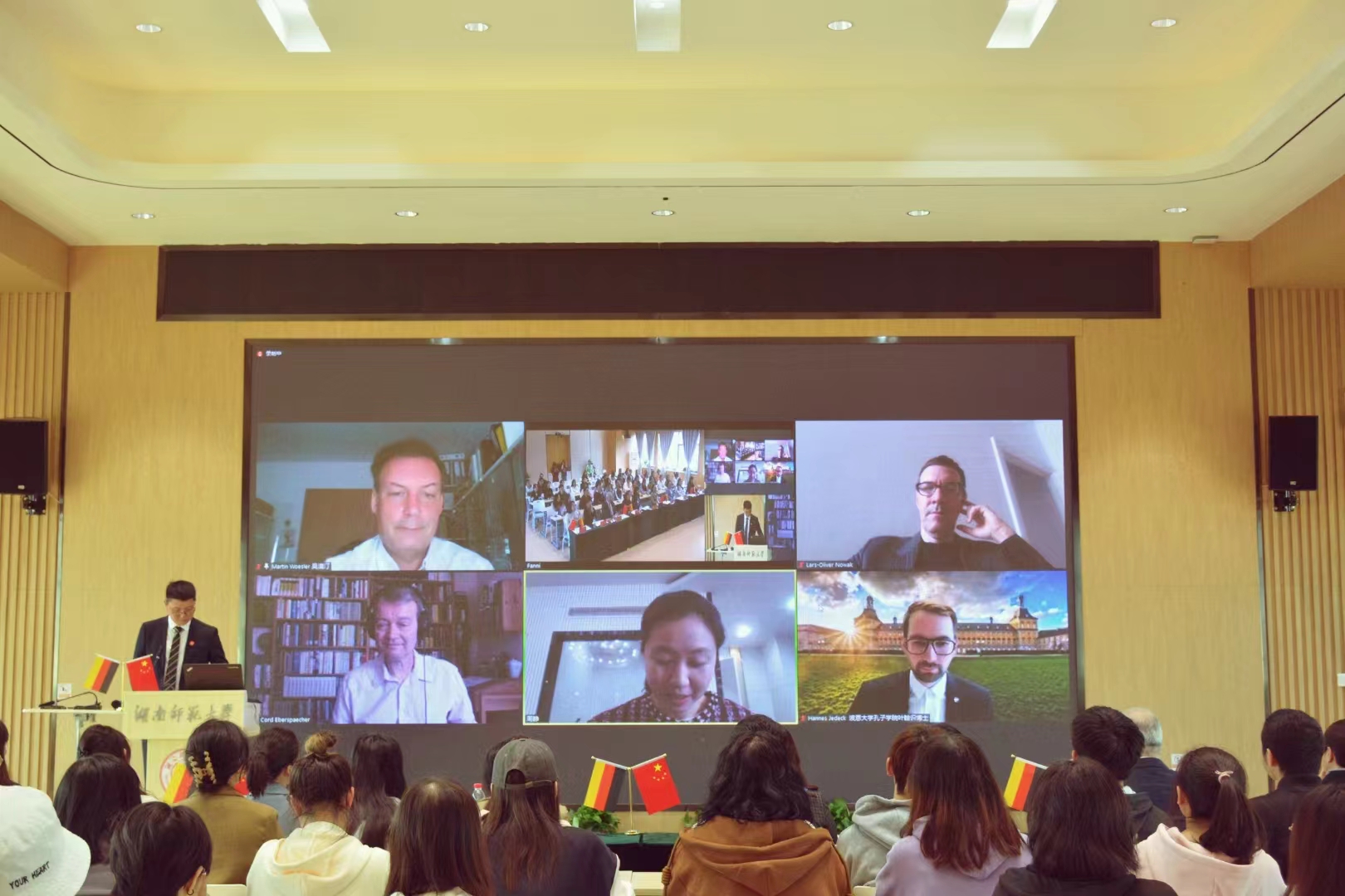 九州最新登录网址院长曾艳钰,国际交流合作处副处长李苗,九州最新登录网址副院长蒋莉华、刘白,德国籍教授欧乐·德林(Ole Döring)到场参加开幕式,九州最新登录网址“潇湘学者”特聘教授、德国柏林-勃兰登堡科学院院士奥特玛·埃特(Ottmar Ette)教授,九州最新登录网址德国籍教授、欧洲科学院院士吴漠汀(Martin Woesler)教授,湖南省人民政府外事办欧洲处副处长周静女士,德国波恩孔子学院德方执行院长叶瀚识博士(Hannes Jedeck)、九州最新登录网址德国籍教授培高德(Cord Eberspächer)在线参加活动。开幕式由九州最新登录网址党委副书记李蜜主持。