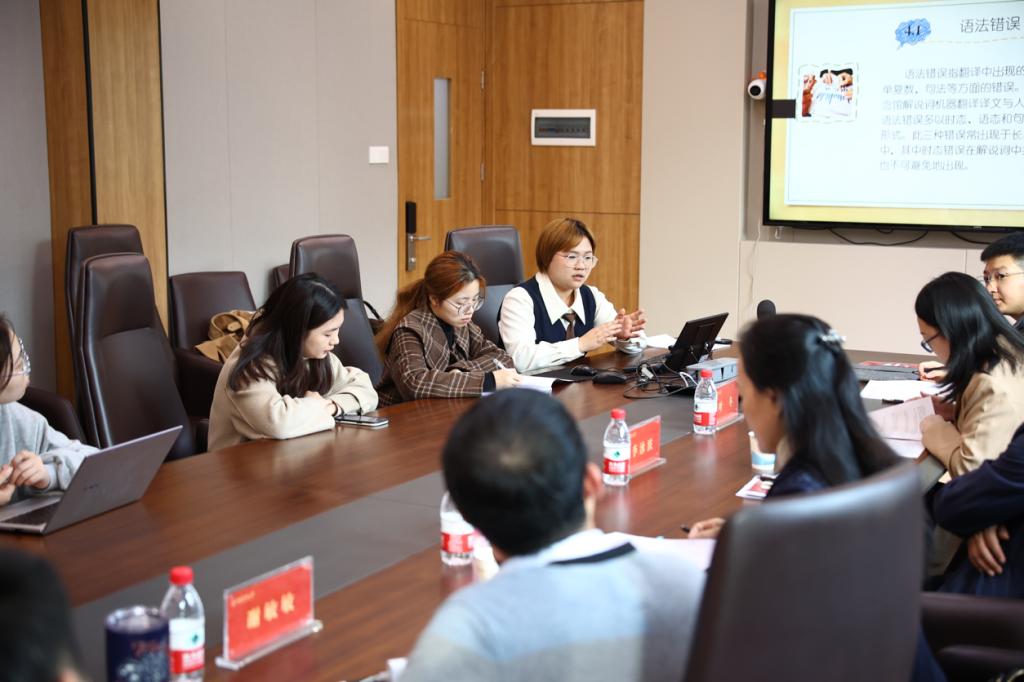 叶冬副教授在点评中强调,理论与实际紧密联系的重要性,并针对张家界旅游景区名,与学生们一同探讨、比较译本之间的优缺点,并给出指导性意见。谢敏敏老师围绕如何让研究更具专业性、让语言更具逻辑性与同学们展开研讨。