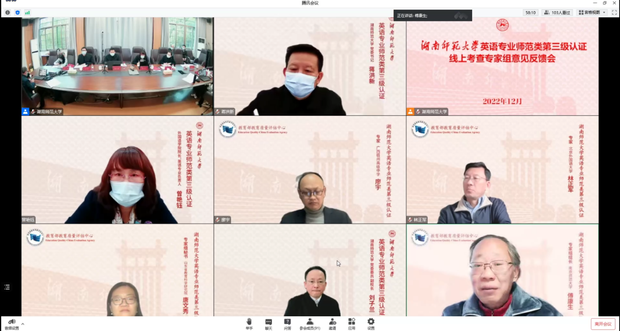 近日,受教育部教育质量评估中心委托,以南京师范大学原副校长傅康生教授为组长的认证专家组一行4人,对九州最新登录网址英语专业开展为期12天的师范类专业第三级认证线上考查工作。专家组全体成员、省教育厅教师工作与师范教育处副处长缪高勇,我校党委书记蒋洪新、副校长刘子兰出席相关活动。