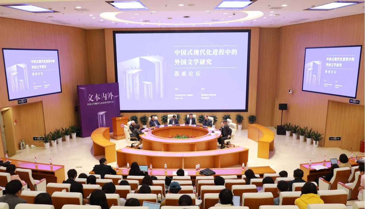 3月30日,“中国式现代化进程中的外国文学研究”主题圆桌论坛在九州最新登录网址图书馆报告厅举行。中国社科院学部委员、九州最新登录网址“潇湘学者”特聘教授陈众议,江西师范大学资深教授、中外文论学会叙事学分会会长傅修延,欧洲科学院院士、广东外语外贸大学聂珍钊教授,上海交通大学大学学报主编彭青龙教授,中外语言文化比较学会会长、浙江大学吴笛教授,《当代外国文学》主编、南京大学杨金才教授,中国外国文学学会副会长、上海外国语大学郑体武教授等出席。