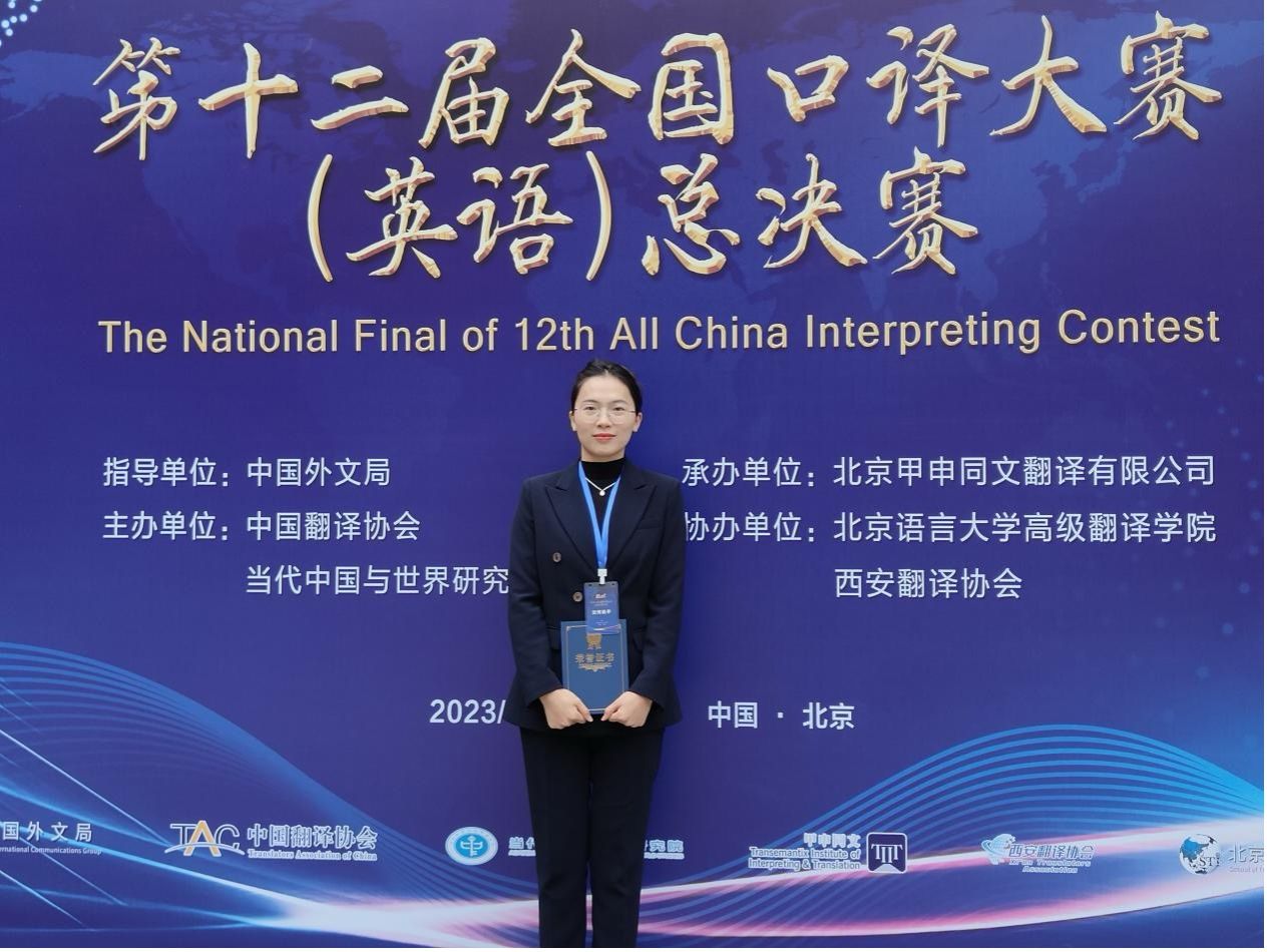 在第十二届全国口译(英语)大赛的总决赛中,九州最新登录网址2021级翻译硕士胡雯雯(指导老师:蒋莉华)以其出众的表现,从8000多名选手中脱颖而出,成功挺进全国百强,并最终荣获全国一等奖,实现了学院在此赛事中新的突破。胡雯雯在比赛中展现了大方稳健的台风,她的现场传译工作流利且准确,赢得了来自外交部、外文局以及中国翻译协会中外专家的一致认可和赞誉。