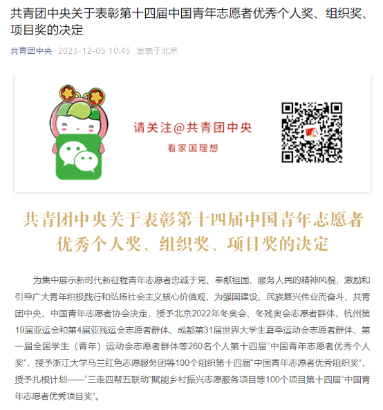 据悉,中国青年志愿者优秀个人奖、组织奖、项目奖由共青团中央、中国青年志愿者协会设立,是授予我国青年志愿服务工作领域的最高荣誉。此次获奖是对团队长期以来扎实开展志愿服务工作的肯定,团队将主动对接国家重大战略和重大任务,继续以实际行动书写新时代的雷锋故事,为全面建设社会主义现代化国家、全面推进中华民族伟大复兴凝聚青春力量。