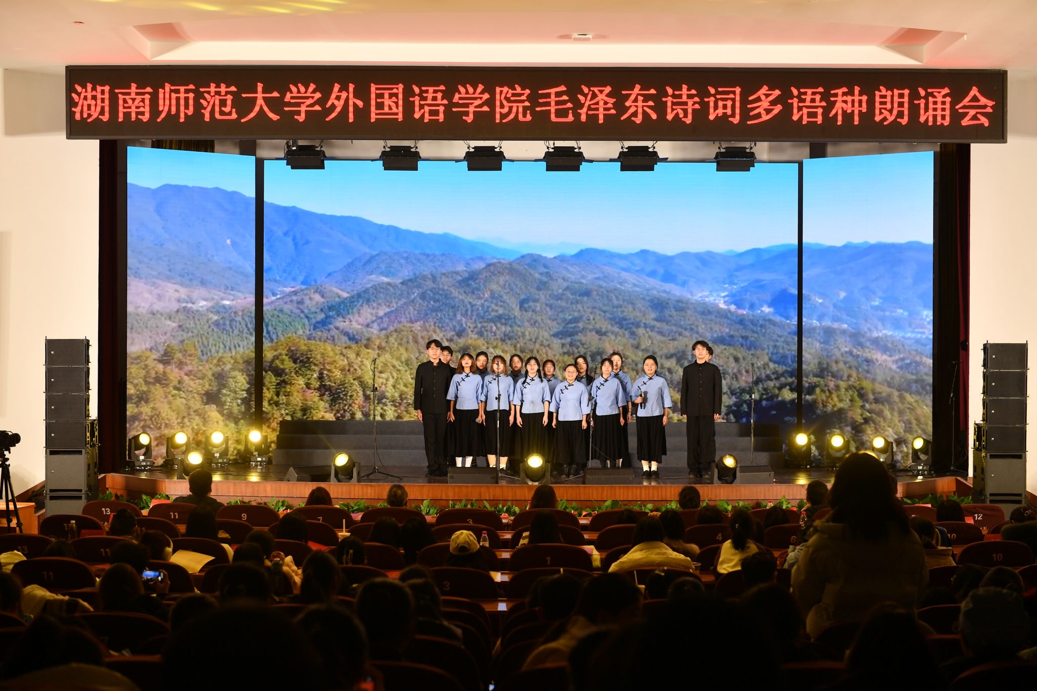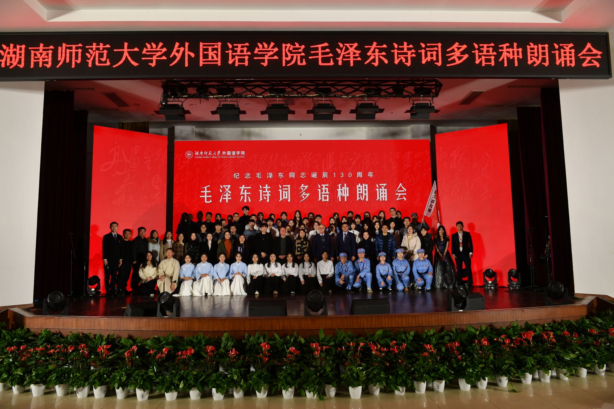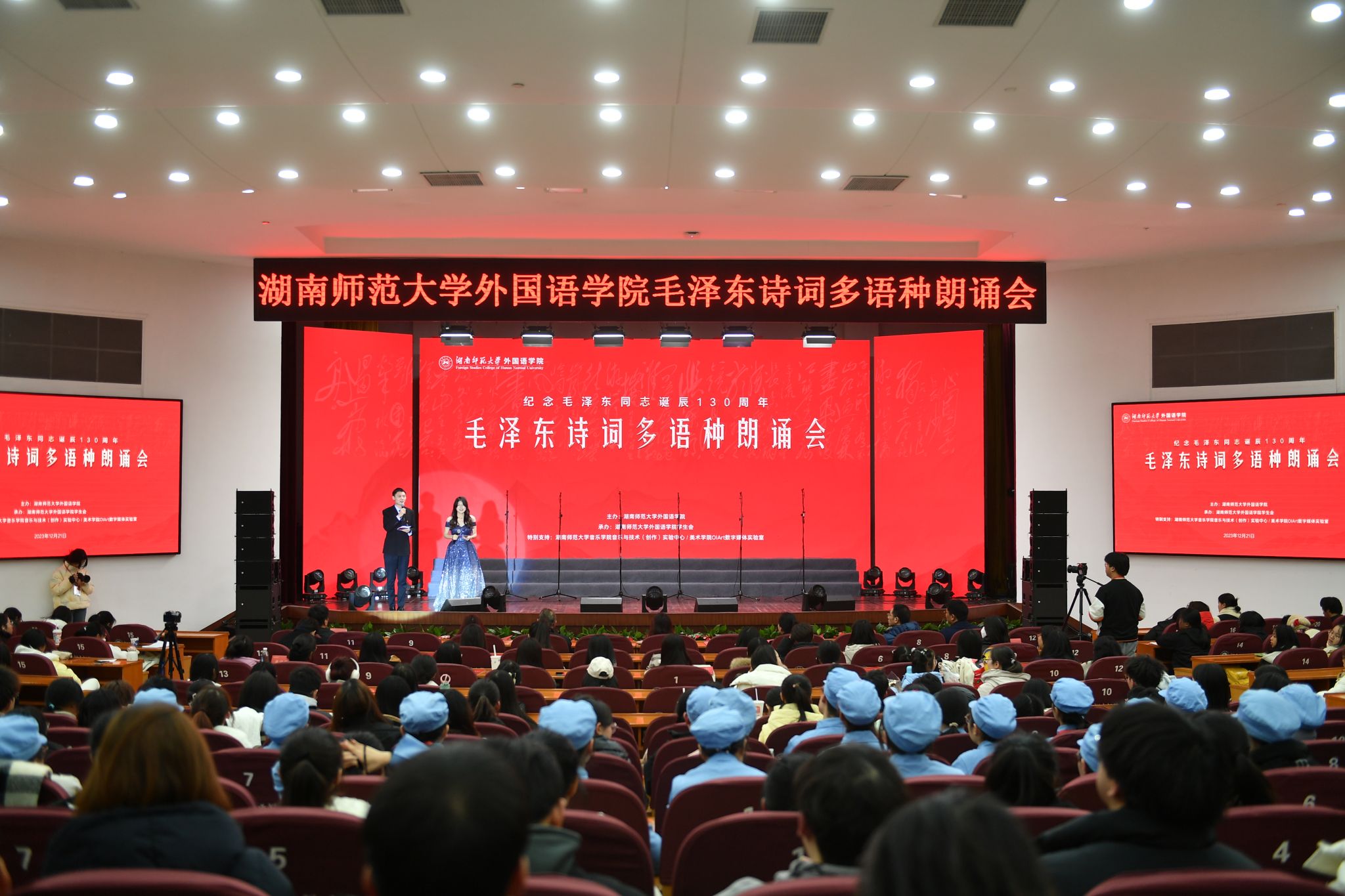 (通讯员 吴黛琳)12月21日晚,学院在国际学术报告厅举办纪念毛泽东同志诞辰130周年·毛泽东诗词多语种朗诵会。院长曾艳钰,院党委副书记李蜜,副院长刘白、蒋莉华、梁斌出席观看。活动由2022级比较文学与跨文化研究专业硕士研究生胡云天、2022级英语专业本科生韩佳琪主持,来自各专业、各语种的200余名本科生、研究生和留学生参与朗诵会演出。