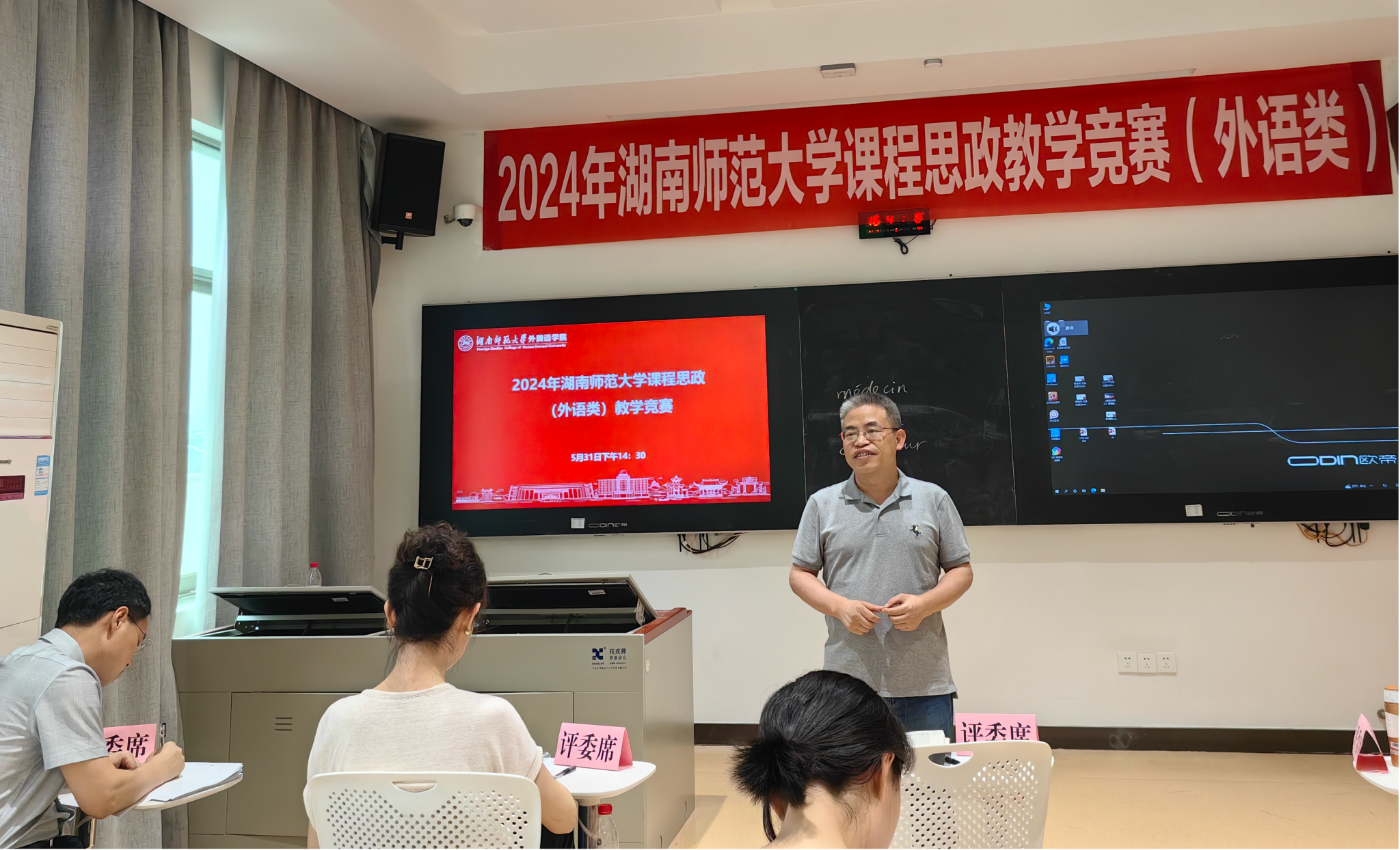 31日下午正式比赛当天,经过紧张激烈地角逐,五位评委对选手对现场教学表现进行了打分。评分汇总后,严文烨、刘云雁、黄逸佳荣获一等奖,李亚文、李楚翘、陈丹荣获二等奖。获得一等奖的教师将代表我校参加湖南省普通高等学校外语课程思政教学竞赛。