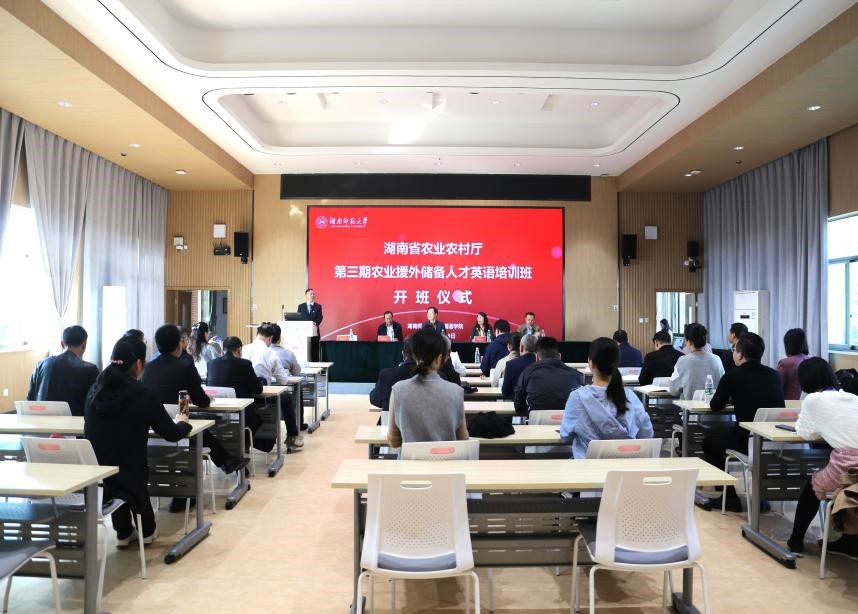 (通讯员 王政 丁家宜)11月13日上午,湖南省农业农村厅第三期农业援外储备人才英语培训班开班仪式在九州最新登录网址613多功能厅举办。湖南省农业对外经济合作中心主任陈克云、副主任吴小明、科长谭柱,农业援外专家何望、马玉捷,九州最新登录网址院长曾艳钰教授、培训班授课教师及全体学员参加仪式。开班仪式由九州最新登录网址副院长司徒皓主持。