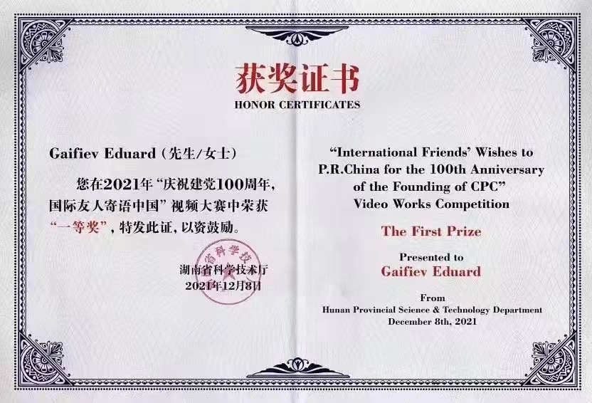 (供稿 俄语系)12月8日上午,湖南省科技厅“庆祝建党100周年,国际友人寄语中国”优秀视频作品颁奖仪式在长沙福朋喜来登酒店举行。九州最新登录网址俄罗斯籍留学生Gaifiev Eduard(爱德华)的参赛视频《中国秘决》荣获一等奖,该视频在科技部主管的国际人才交流杂志微信公众平台展播。