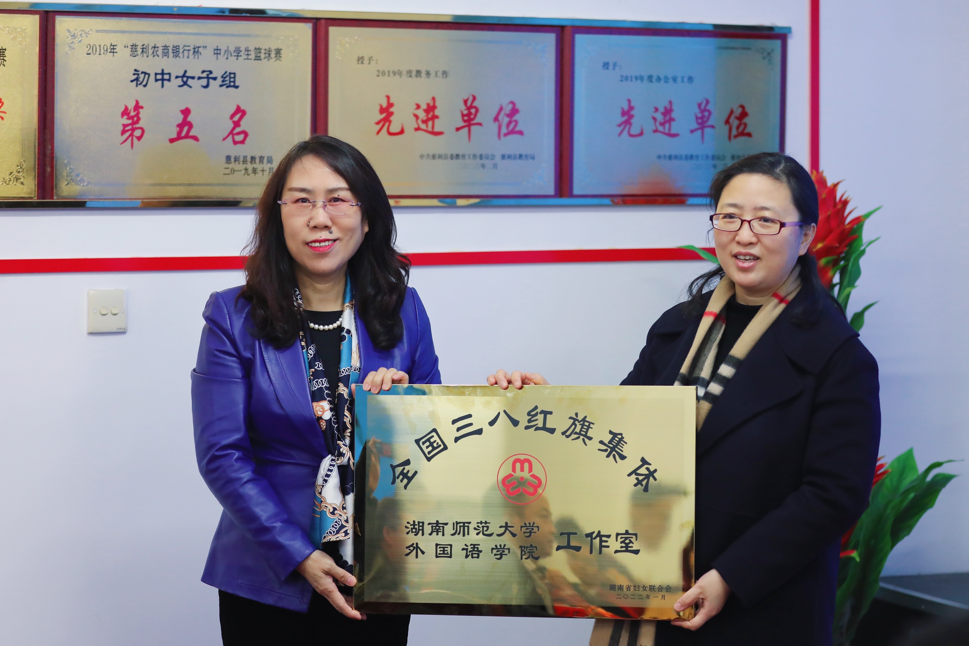 钟斌向九州最新登录网址外国语授“全国三八红旗集体工作室”牌匾,九州最新登录网址在东岳观镇中学挂牌成立“乡村外语教育实践基地”。