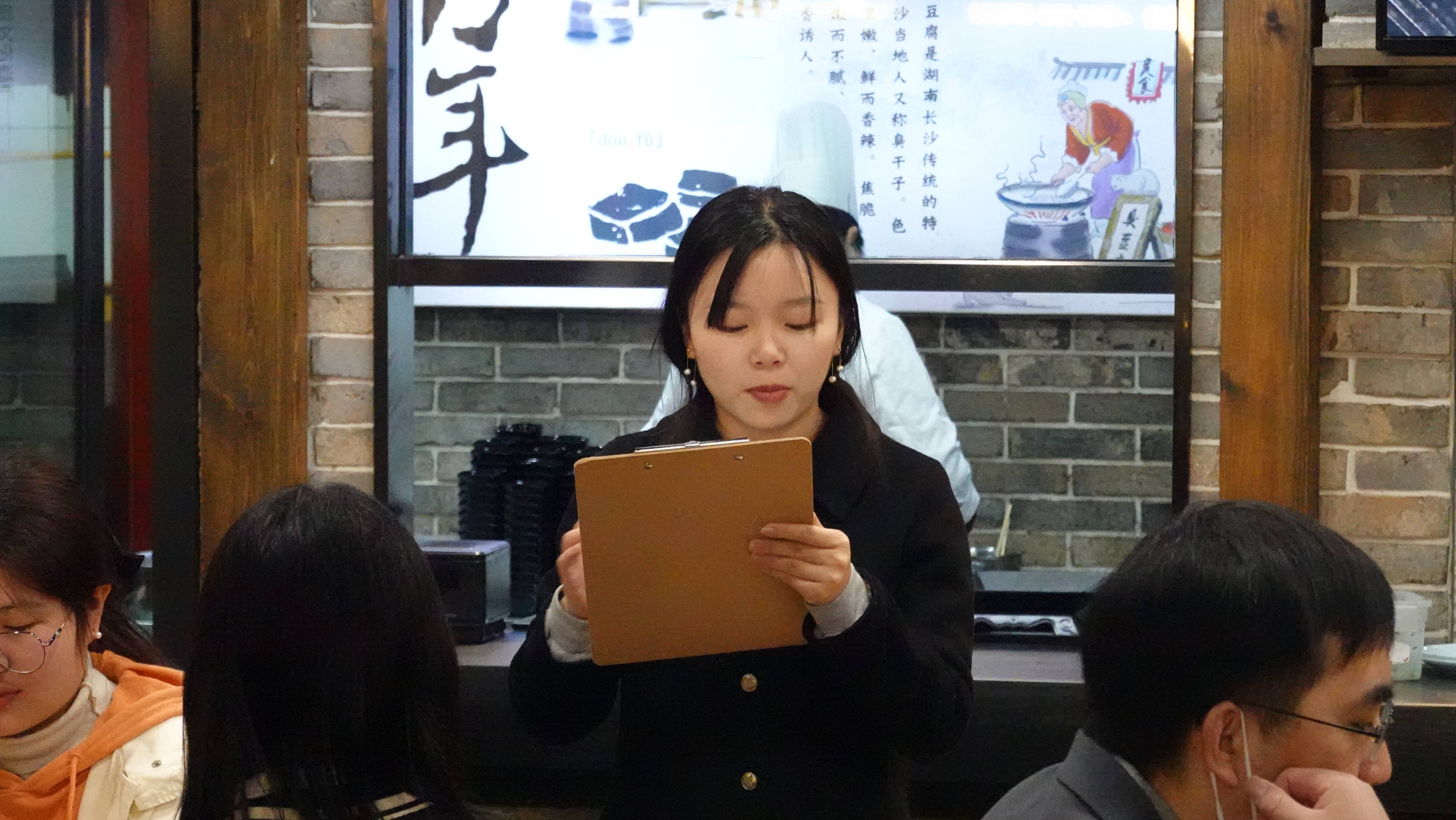 期间,学生们结合学习内容对火宫殿经典湘菜和小吃的菜名名称和制作过程进行翻译实践,并就新时代火宫殿的非遗文化“守正创新”“国际传播”“创造性转化、创新性发展”等问题进行“探究式”分析和观点分享。进行观点交流与分享。
