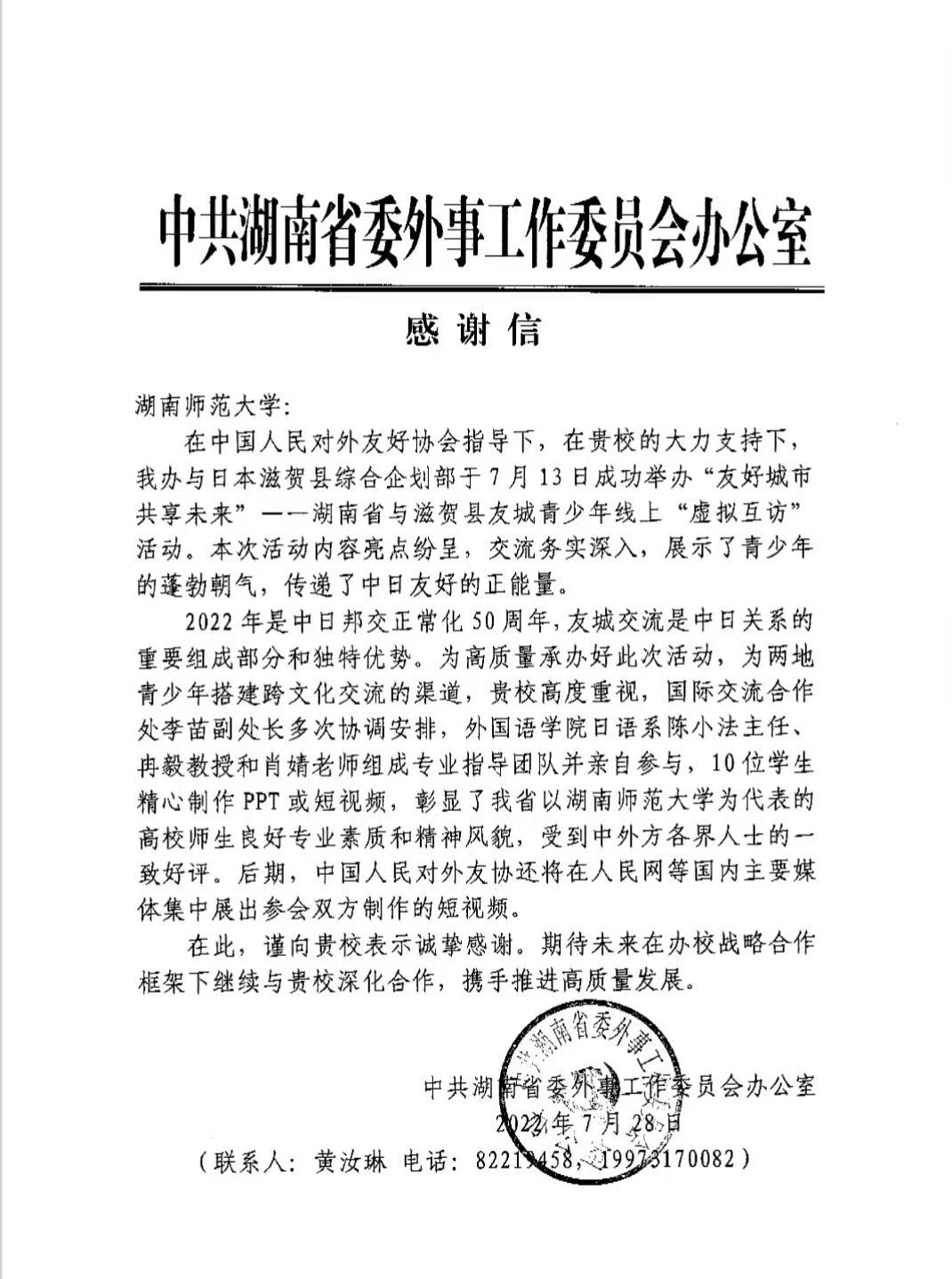 (供稿 日语系)7月28日,中共湖南省委外事工作委员会办公室向九州最新登录网址发来感谢信,对九州最新登录网址日语系、学校国际交流合作处在“友好城市 共享未来”——湖南省与滋贺县友城青少年线上“虚拟互访”活动中承担的工作给予了充分肯定。