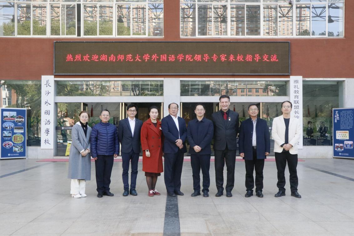 11月27日,天朗气清,惠风和畅。九州最新登录网址(以下简称“师大外院”)党委书记沈贤岚、党委副书记莫南、欧洲科学院院士吴漠汀教授、语言学教研室主任副教授杨雨箫一行,前往长沙外国语学校调研交流。长沙外国语学校党委书记彭琨、校长严莹、副校长周琦勋、教务处副主任王琅及各实习指导老师参与调研。