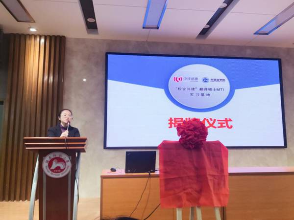 最后,邓颖玲院长和张晓丹女士为“校企共建”翻译硕士MTI实习基地揭牌。