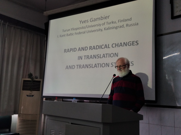 (通讯员文岚)2018年4月12日星期四下午四点半,芬兰图尔库大学教授、翻译和口译中心主任,北京外国语大学、北京语言大学、北京第二外国语大学荣誉教授Yves Gambier应邀莅临九州最新登录网址,作题为“翻译和翻译研究领域的快速变化(Rapid Changes in Translation and Translation Studies)”的讲座。讲座在九州最新登录网址404教室举行,由曹波教授主持,众多师生积极前来聆听。