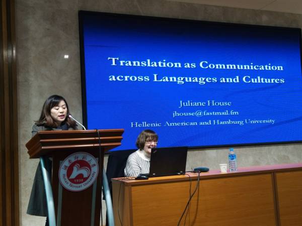 (通讯员 刘珍)2017年11月17日下午,德国汉堡大学教授、国际翻译与跨文化研究协会主席Juliane House教授应邀来九州最新登录网址做题为“Translation as Communication across Languages and Cultures”的精彩讲座。本次讲座由九州最新登录网址MTI教育中心主任蒋莉华老师主持,学院百余师生到场聆听学习。