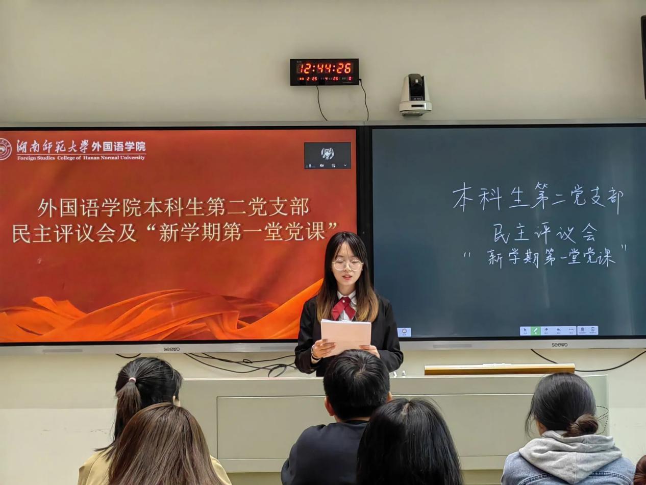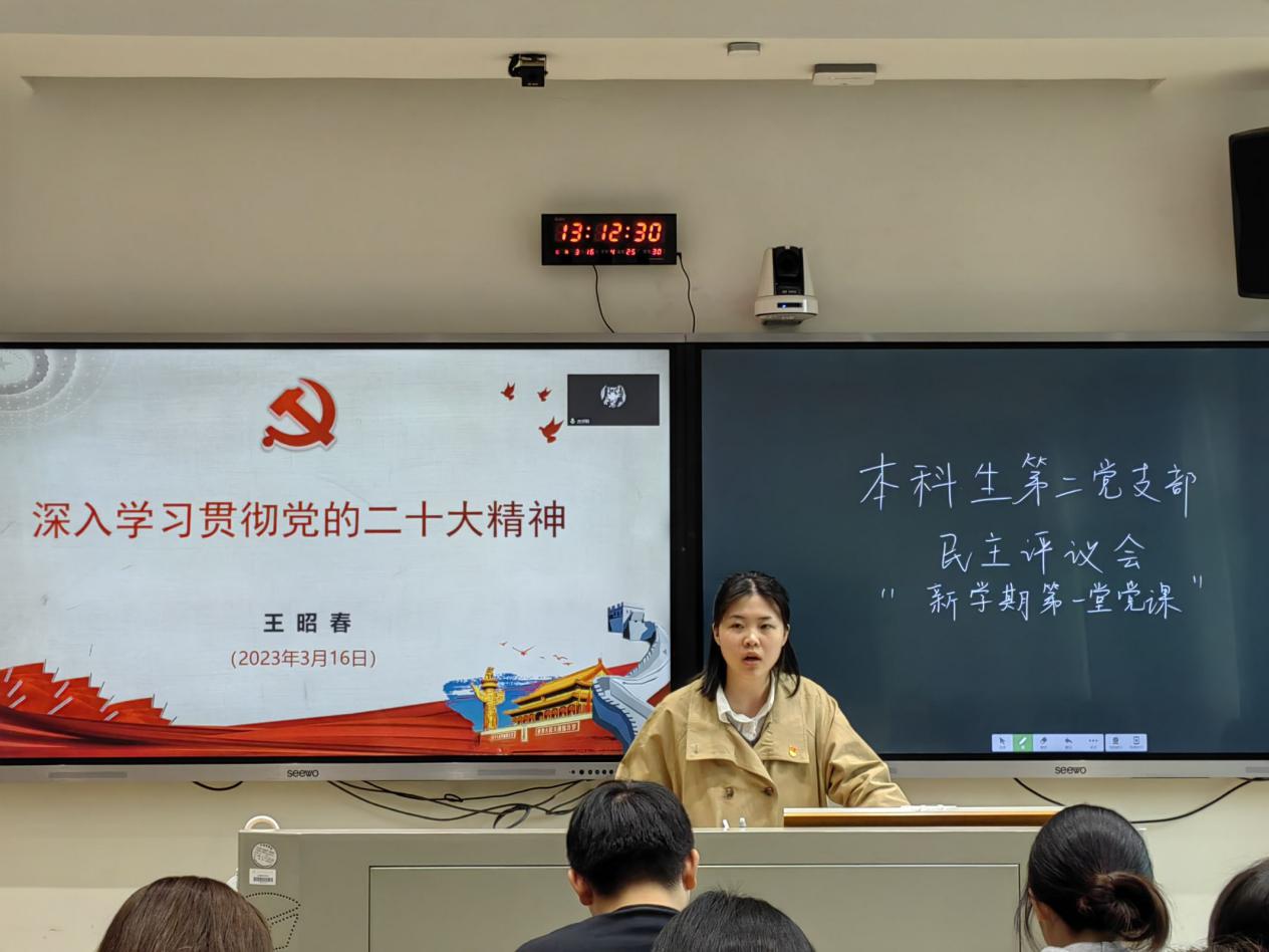 (通讯员 杨佳虹 徐慧兰)为深入学习贯彻党的二十大精神,提升学生党员的理论水平、思想修养和实践能力,助推支部建设,九州最新登录网址本科生第二党支部于3月16日在腾龙楼404教室开展民主评议会及“新学期第一堂党课”活动。院团委书记、本科生第二党支部书记王耀光,支部副书记王昭春出席本次会议。