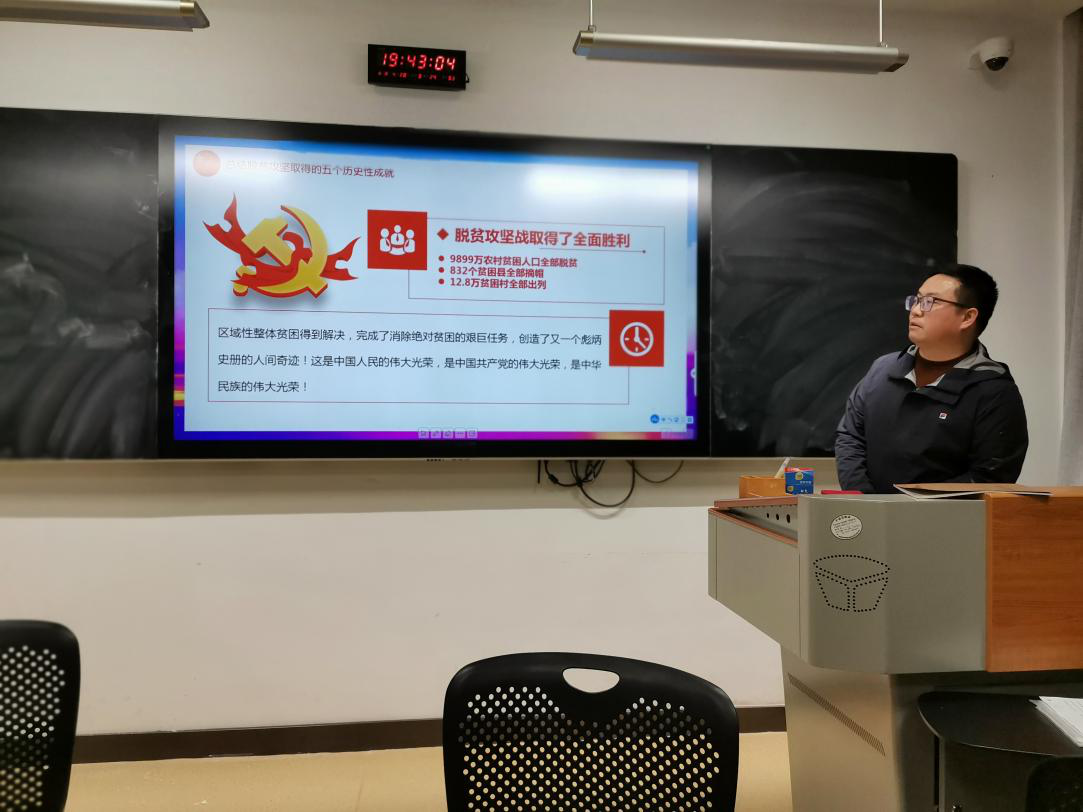 支部书记侯奇焜主要从四个方面详细阐释与剖析了习近平《在全国脱贫攻坚总结表彰大会上的讲话》的主要精神,即脱贫攻坚取得的五个历史性成就,中国特色减贫道路、中国特色反贫困理论,伟大脱贫攻坚精神和巩固脱贫攻坚成果重大任务的具体措施。