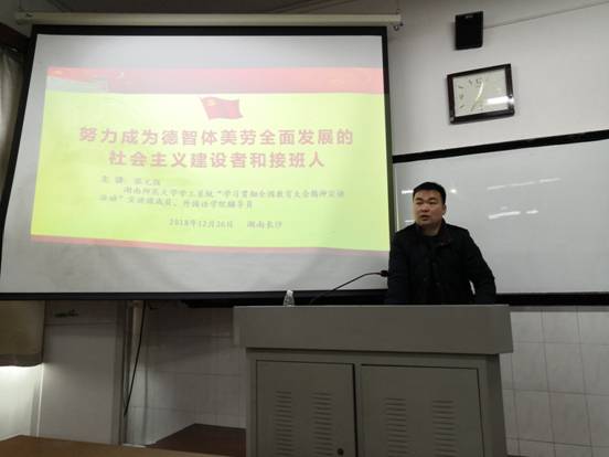 张元强老师首先从一个基本战略、一个历史事实、一个总体要求、一个首要问题、一项重要任务、一项改革硬任务、一个根本保证等八个方面为大家解读了全国教育大会精神要义。随后,张老师分享了教育部部长陈宝生、湖南省委书记杜家毫、副书记乌兰等领导的重要讲话,帮助支部成员更准确地理解部省领导来校讲话要求。最后,他对青年大学生提出了几点殷切期望,希望同志们成为胸怀理想、素质全面、崇尚奋斗的湖南师大人。