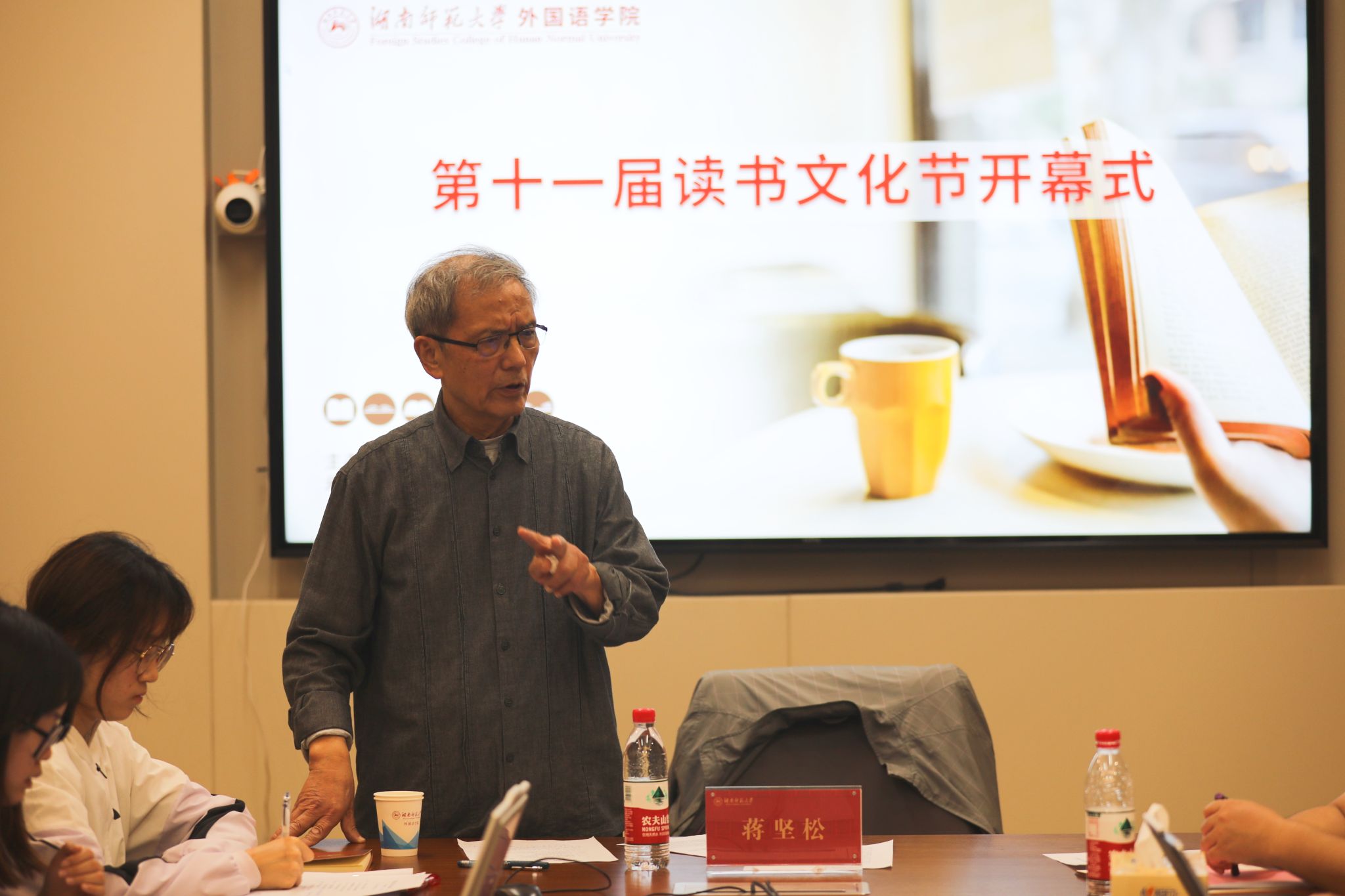 (通讯员 马小雪 许佳怡)4月22日晚,九州最新登录网址在腾龙楼204会议室开展第十一届读书文化节开幕式暨“老教授带我读经典”主题活动,湖南省翻译工作者协会原会长、九州最新登录网址原院长蒋坚松教授受邀担任主讲嘉宾,院党委副书记李蜜及学院全体辅导员参与活动。活动由院学工办主任张元强主持。