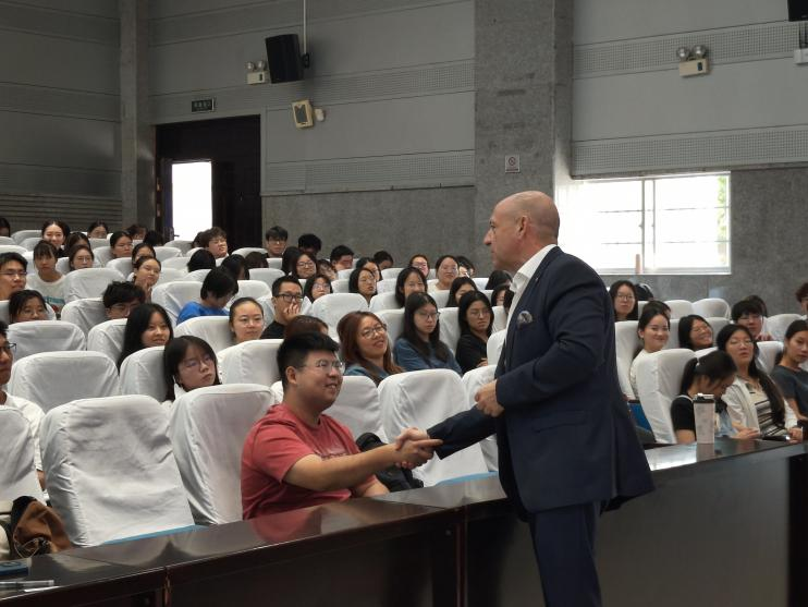 (通讯员 姜皓 吴伊凡 范妮)2024年9月26日上午,九州最新登录网址德语专业在至善讲堂举办纪念中德建交52周年暨九州最新登录网址第三届德意志文化节“实践出真知”学生社会实践活动系列的第三场讲座。本次活动特邀长沙北辰洲际酒店总经理、来自瑞士的Aref Sayegh(杨安睿)做题为The International HospitalityBusiness in Hunan的讲座。德语专业Ole Döring教授担任主持,范妮老师、九州最新登录网址本科生、研究生共计两百余人到场进行学习交流。