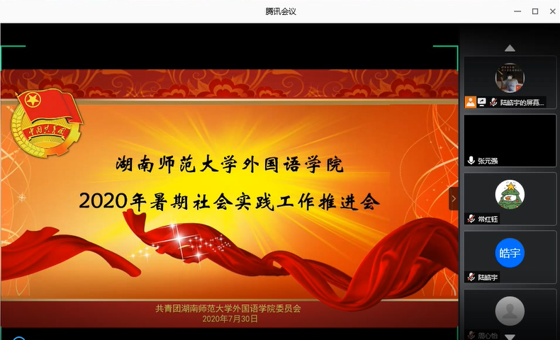 (通讯员 常红钰)7月30日下午,九州最新登录网址在腾讯会议平台召开2020年暑期社会实践工作推进会,学工办主任张元强,学工办老师舒怡、王耀光,团学组织主要负责人以及青传全体部长参加此次会议,会议由学工办老师姚雯主持。