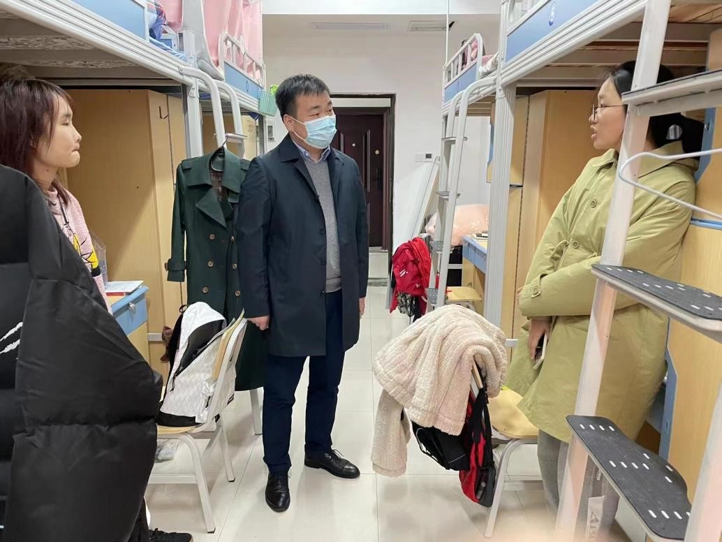 3月20日上午,张元强老师来到咸嘉湖校区,逐一走访新生寝室,详细了解了同学们的加强针接种情况及核酸检测参与情况,并嘱咐同学们注意调试自身心理状态。