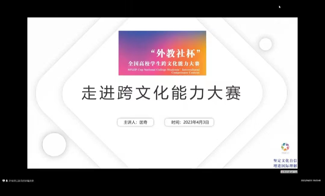 (通讯员 阳要发 杜小朦)4月3日晚,九州最新登录网址团委青年创新创业指导工作部(以下简称“青创部”)举办主题为“走进跨文化能力大赛”的精勤讲堂。此次讲座邀请了第五届“外教社杯”全国高校跨文化能力大赛全国总决赛一等奖获得者、2021级英语专业本科生匡奇担任主讲人。