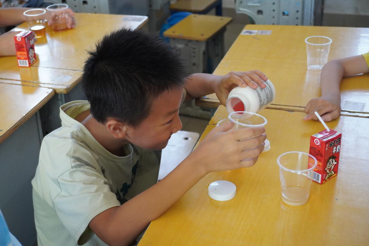 在“一起化化吧”的课堂上,余众以简单的叶片结构图引入,并利用日常植物,让同学们进行拆分,组成一幅幅植物画。同学们在动手过程中加深了对不同植物结构的了解,加强了对生活中科学事物的观察力。“饮料化学家”课堂中,余众指导同学们用柠檬茶与苏打水两种不同性质的饮料进行中和,随后他进行品尝并评价效果。同学们通过亲身体验,了解“化学是变化之学”、“物质是由多种微小元素组成的”等化学思想。
