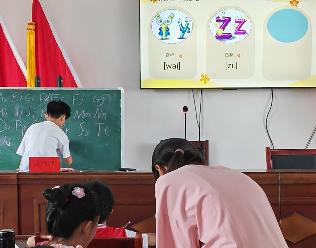 课堂由实践团成员刘小萍主讲。课堂开始,刘小萍引导学生依次学习了英文字母表与国际音标,并向学生强调了它们的重要性。随后,通过图文结合的方式进行英语基础对话教学并组织学生进行演绎。