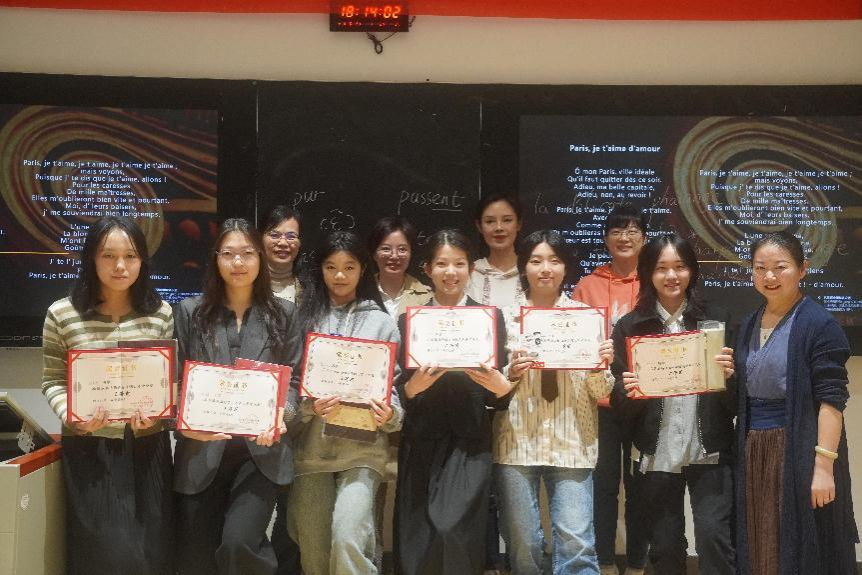 最后,方丽平老师、王芳老师、陈丹老师为获奖同学颁发奖状和奖品。各位老师与同学们合影留念,由吴巧巧和黄乐妍同学拍照记录。至此,本次法语语音语调大赛圆满结束。