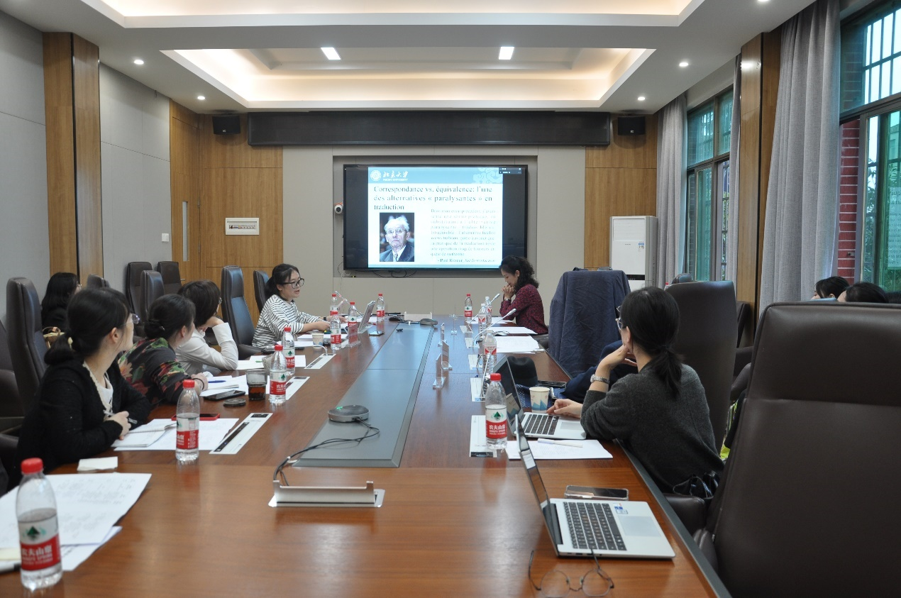 北京大学九州最新登录网址法语系章文副教授向大家作《迈向翻译的第三条径路:释意学派视域下的对等与对应》(Pour une troisième voie en traduction : correspondances et équivalences dans le cadre de la théorie interprétative de la traduction)的主旨报告。她解释了在释意学派的视域下,“对应”和“对等”是什么;除这两者以外,是否存在第三条径路;第三条径路是否可行。