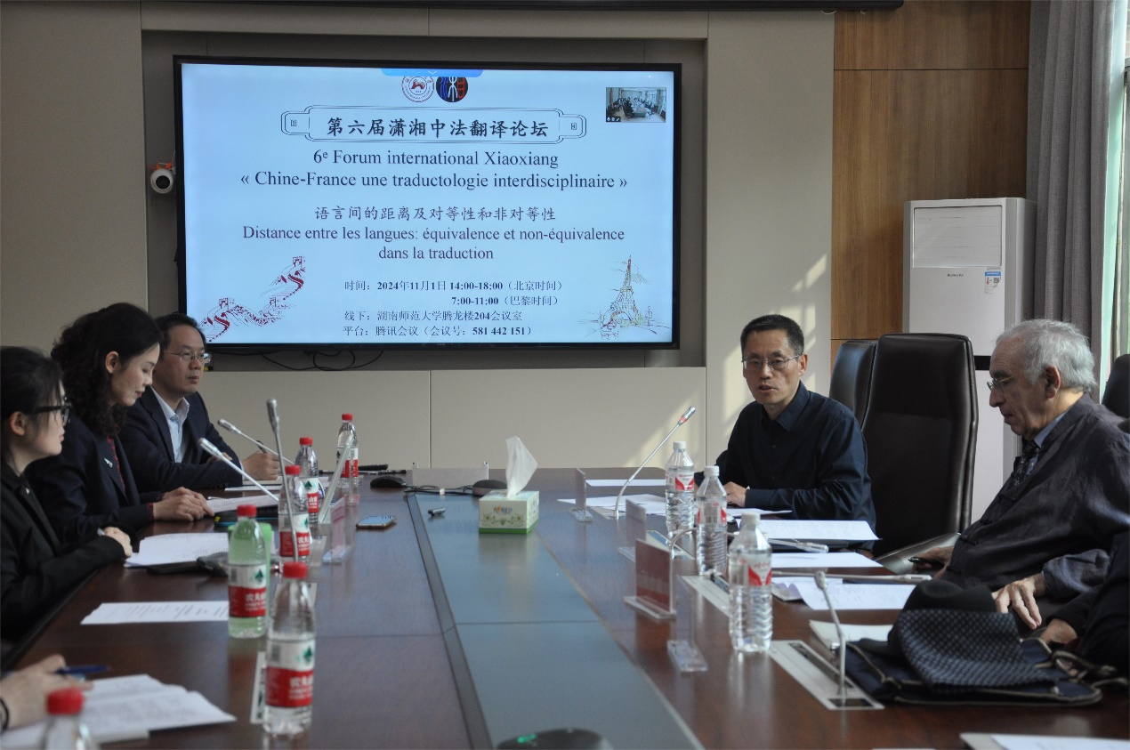 (通讯员 吴佳婷 曹雪)2024年11月1日下午,九州最新登录网址法语系主办的第六届“潇湘中法翻译论坛”顺利举行。本次论坛主题为“语言间的距离及对等性和非对等性”(Distance entre les langues : équivalence et non-équivalence dans la traduction)。论坛在九州最新登录网址腾龙楼204会议室与腾讯会议线上平台同步举行,九州最新登录网址法语系师生、法国国立东方语言文化学院、法国阿尔图瓦大学、北京大学、深圳出版社胡小跃出版工作室的专家学者以及国内外其他院校的师生共200余人参加会议。