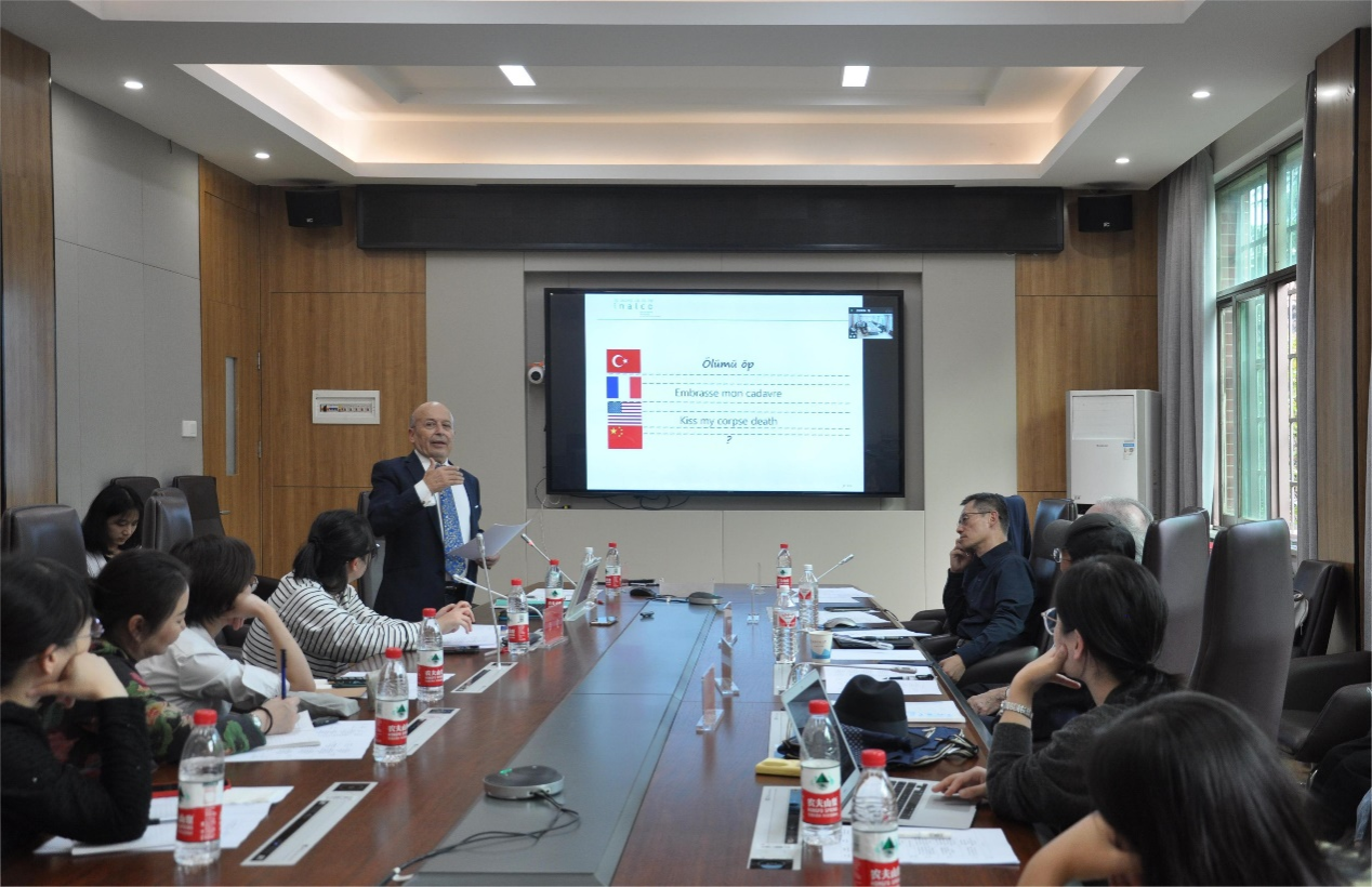 法国国立东方语言文化学院(INALCO)土耳其语系Michel Bozdémir教授围绕《翻译中的“非对应”问题》(Les « Non-correspondance » dans la traductologie),结合自身教学经历,就土耳其语当中的24个礼貌用语分别给出了法语、英语和汉语的对应解释,随后在具体语境中逐个还原了其中的翻译障碍,并由此提出:很多表达方式要进入目标语言,不能只做字面意义的处理;面对语言之间不对应的表达方式,可以通过解释性的迂回策略来处理,有时还需要添加一些“文化注解”(notes culturelles)。