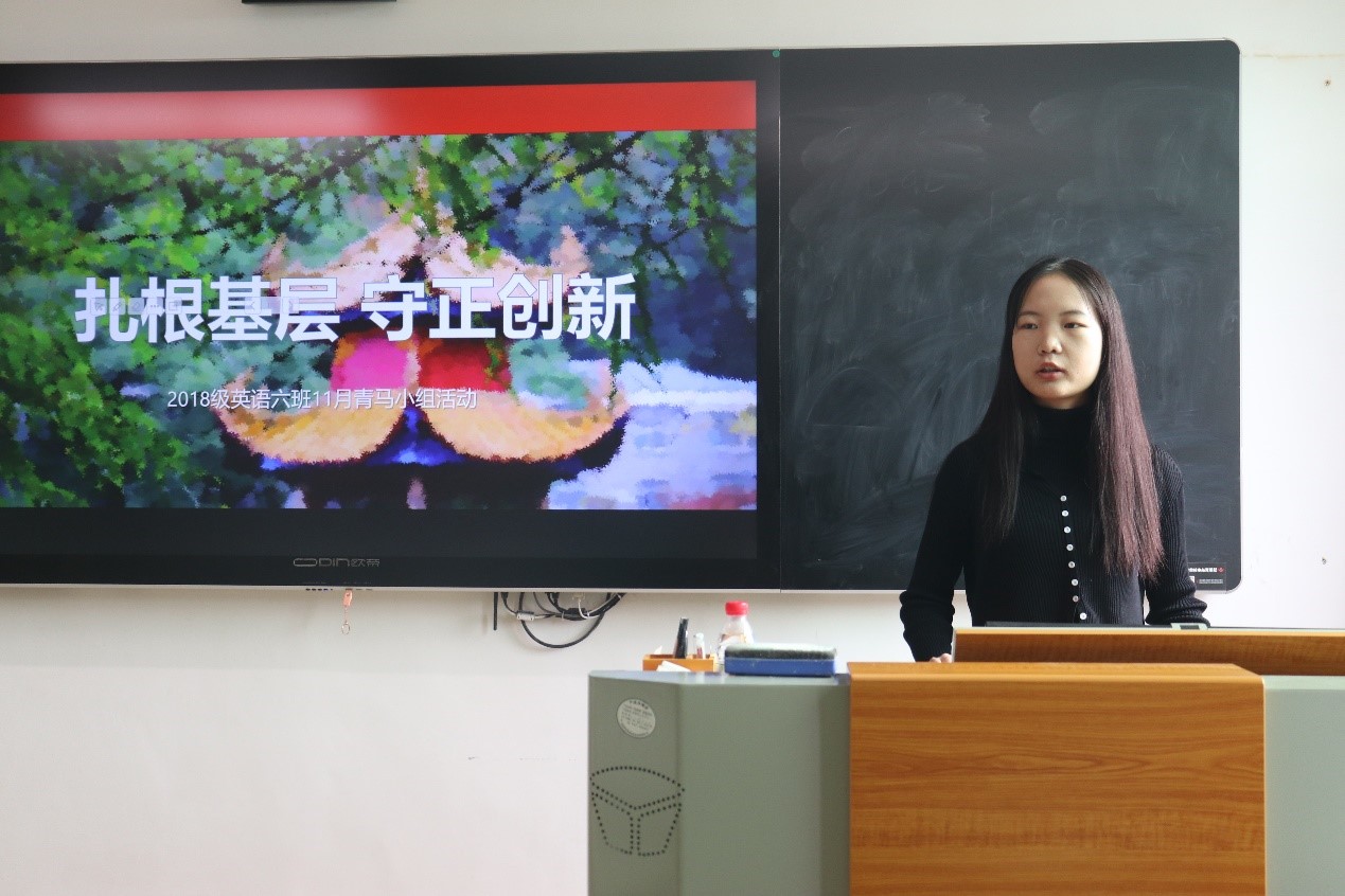 (通讯员 汤巧燕 牛星宇)11月17日上午,18级英语六班团支部青马小组在腾龙楼602教室开展了主题为“扎根基层,守正创新”的青马学习活动。此次活动由青马小组组长王佳祺主持,青马小组全体成员共同参与。
