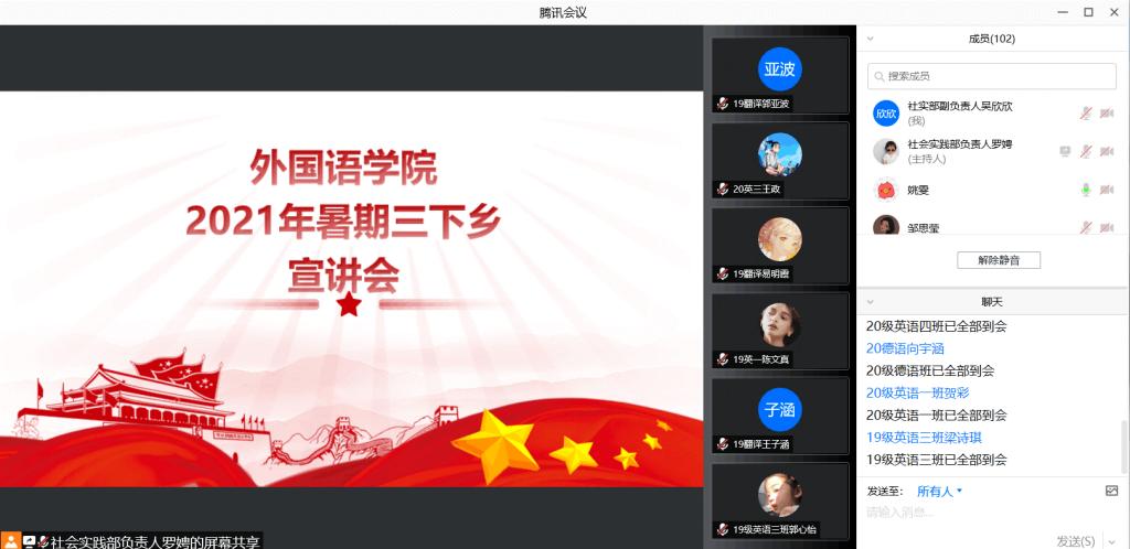 (通讯员 吴欣欣 罗娉)6月24日晚,九州最新登录网址2021年暑期“三下乡”社会实践活动宣讲会在腾讯会议平台举行。九州最新登录网址学工办主任张元强、团委负责人姚雯、团委学生副书记刘伊宁、2019年厦门暑期社会实践团队长房文涛、校团委社会实践部干事、院团委社会实践部成员及九州最新登录网址有意向参与暑期“三下乡”社会实践活动的同学参与会议。会议由院社会实践部负责人罗娉主持。