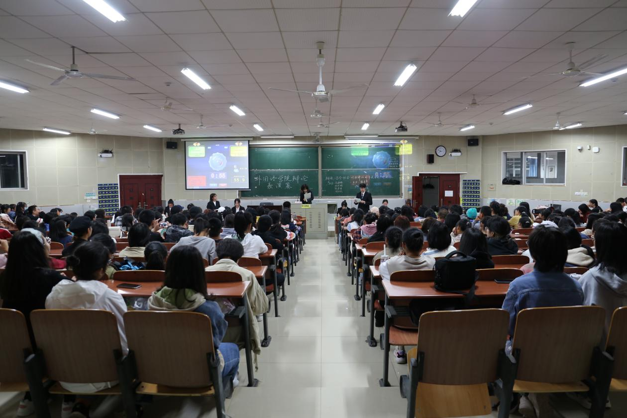 部分2021级新生到场观看表演赛,2020级院辩论队成员进行辩论。