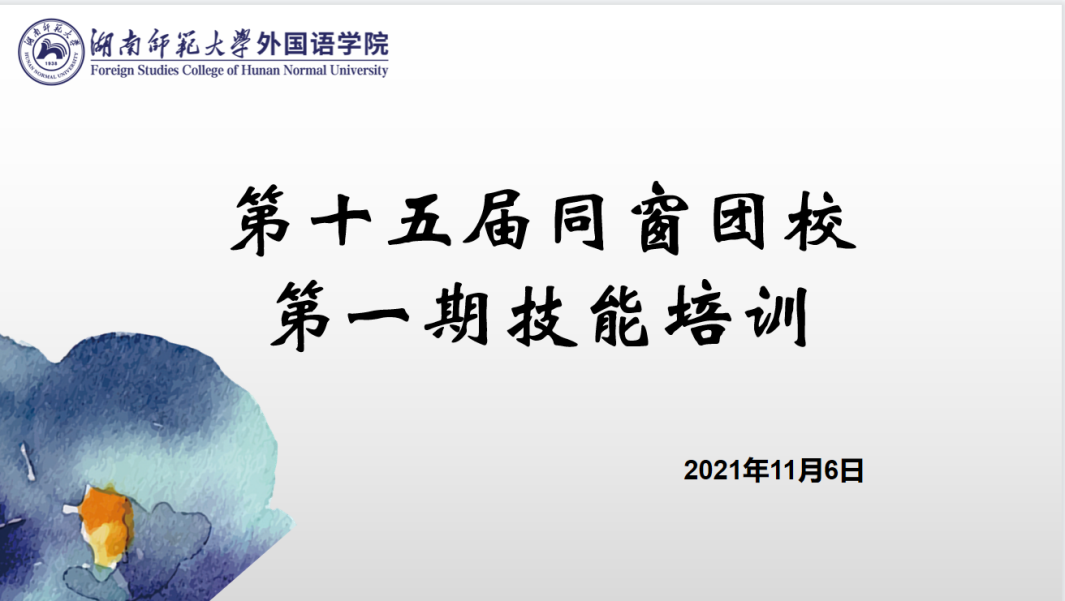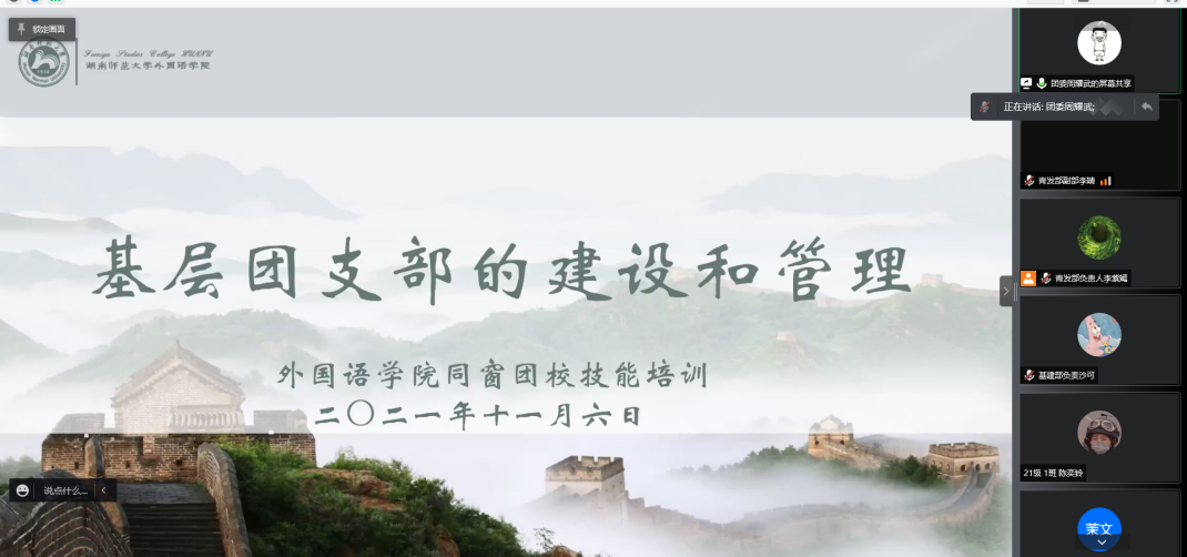 (通讯员 李紫嫣 匡惠美)11月6日上午,为推进基层团支部建设工作的顺利开展,外院开展第十五届同窗团校第一期技能培训之基层团支部的建设与管理。本次培训以线上形式开展,外院全体团委成员和新任团干参与培训。此次培训由团委学生副书记周耀武主讲,青年发展工作部副负责人李婧主持。
