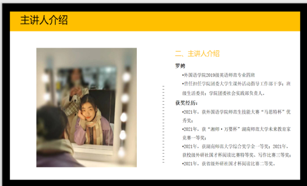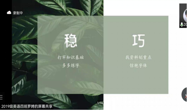(通讯员 朱茹玉)12月11日下午,九州最新登录网址团委青年创新创业指导工作部(以下简称青创部)在腾讯会议上举办主题为“行稳致远,以巧凸显”的精勤讲堂。本次讲堂邀请曾获“湘师·万婴杯”九州最新登录网址未来教育家竞赛一等奖、19级英语四班的罗娉担任主讲人。