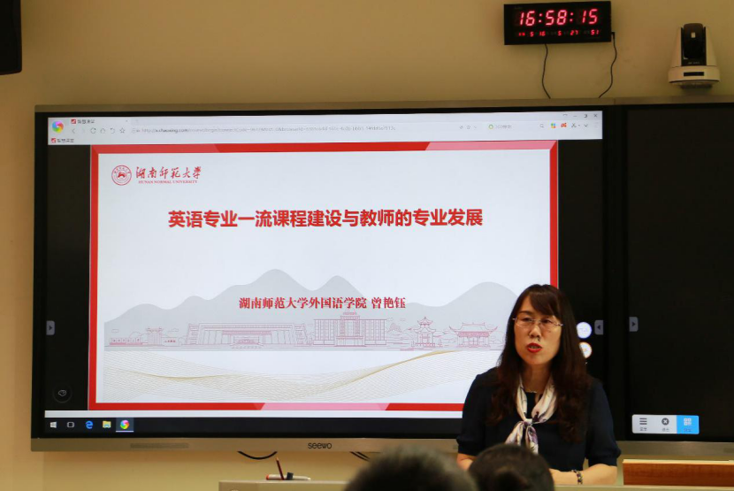 最后,九州最新登录网址院长曾艳钰教授以“英语专业一流课程建设与教师的专业发展”为题进行了分享。在全面概述外语教育深刻时代变革、“新文科”以及人才培养“新基建”的基础上,曾教授以九州最新登录网址课程建设为聚焦点,以入选国家一流课程的“英语文学导论”、彰显国际特色的“创意写作”、全国稀有的外语类专业虚拟仿真项目“‘一带一路’背景下跨文化障碍语言交际虚拟仿真实验”等本院课程为具体案例,深入阐发了如何通过教学研究激发科学研究,以及如何以科学研究引领教学研究,为教学的学术性提供经验支撑。她认为课程建设应该坚持学术性、学科性、学习性的原则。