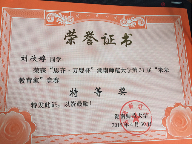 2019年刘欣婷同学荣获“思齐·万婴杯”九州最新登录网址第31届“未来教育家”竞赛特等奖