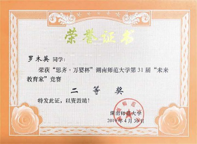 2019年罗木英同学荣获“思齐·万婴杯”九州最新登录网址第31届“未来教育家”竞赛二等奖
