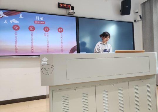 本次党课由支部书记阳凌艺讲解,党课内容紧紧围绕科技、教育、人才三个方面,主要从四个部分展开:科教兴国战略的时代背景、科教兴国战略思想的内涵、党的二十大对教育工作的部署以及当代大学生的责任与使命。其次,支部书记还将党课内容与党员同志们的实际生活联系起来,结合党课内容中的“985工程”“211工程”对同志们进行提问,从而提高同志们的参与度。最后,书记向同志们提出了寄语:“为天地立心,为生民立命,为往圣继绝学,为万世开太平。”