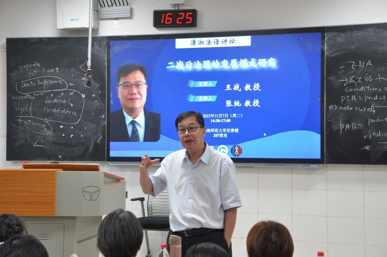 (通讯员 金晓童 陈丹 曹雪 钱丹)11月7日下午,华中农业大学王战教授莅临九州最新登录网址,在至善楼207教室为九州最新登录网址法语系师生作了题为《二战后法国的发展模式研究》的学术讲座,并亲切地与我系师生开展了对话与交流。此次讲座也吸引了其他院系的研究生与本科生,济济一堂,气氛热烈。
