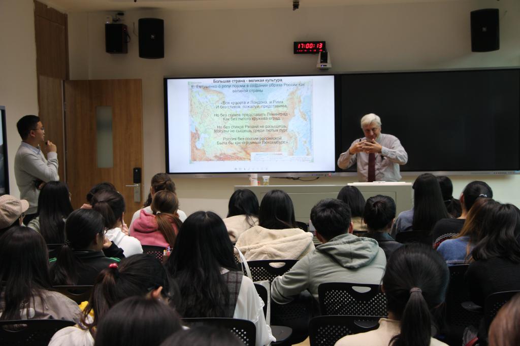 (通讯员 王喜)11月14日下午,九州最新登录网址湖南省俄罗斯文化研究与交流中心在九州最新登录网址304教室举办了一场主题为“文化地理视角下的俄罗斯”的学术讲座,主讲嘉宾为俄罗斯莫斯科国立大学外语区域学系教授、俄罗斯地理学会成员、莫斯科国立大学发展项目奖获得者В. Н.卡卢茨科夫(Владимир Николаевич Калуцков)教授,俄语系颜志科老师担任主持,俄语系及其他各系师生共60余人到场聆听学习。