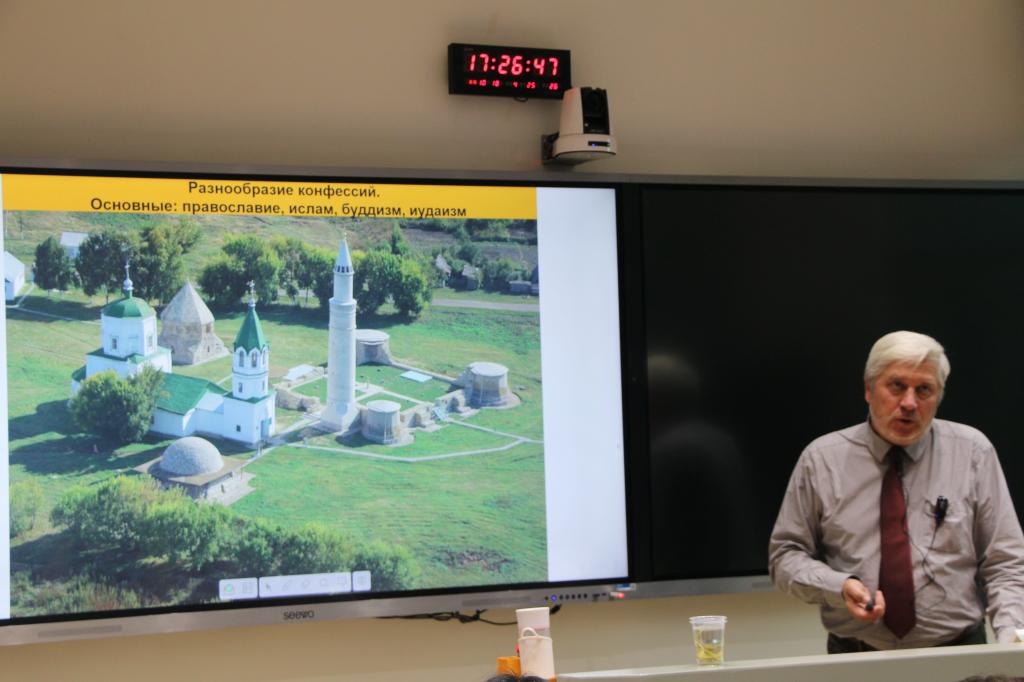 卡卢茨科夫教授首先分析了俄罗斯在民族、语言、宗教等方面的特点,得出了俄罗斯是一个俄罗斯民族占人口大多数,俄语作为官方语言,东正教为主流宗教的背景下的一个多民族、多语言和多宗教信仰的国家。继而对俄罗斯的整体性、中心性和多尺度性特点进行分析,着重指出莫斯科在俄罗斯文化领域的重要作用。最后,主讲人介绍了其个人的俄罗斯文化地理区域划分法,将俄罗斯划分为12个文化地理区,其中7个位于欧洲部分,1个位于欧亚大陆交界处的乌拉尔,4个位于亚洲部分,对每个区域特点进行分析,了解它们的文化和生态资源。讲座帮助同学们对俄罗斯文化地理特性有了更深入的了解,同时剖析了俄罗斯在推进“一带一路”倡议过程中的重要战略地位。