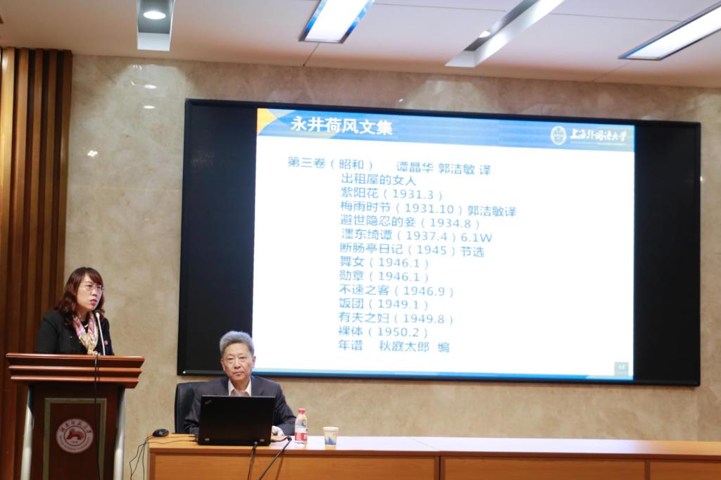 讲座伊始,谭晶华教授首先提到了日本唯美主义文学,指出了其在日本近代文学史的位置,并依次对其主要代表作家及作品做了简要概述。紧接着,谭晶华教授按照从五四运动前后到改革开放前后30年的时间顺序,介绍了国内日本文学作品翻译的发展过程。谭晶华教授还结合了其自身丰富的翻译工作经验,广征博引,论述了文学翻译的若干标准和影响因素,阐述了“翻译理当忠实原作”的具体含义,并以“两个军师”和“二军师”的差别说明了文体对翻译的重要作用,并建议翻译工作者“甘于清贫,不断提高才学”。最后谭晶华教授从创作类型、创作思想、艺术成就等方面着重介绍了日本新浪漫派代表作家永井荷风,指出其作品具有“反逆”、“反战”、“反俗”和“怀古”的特点和倾向。在互动环节,台下师生踊跃提问,谭晶华教授分别进行了详细回答。