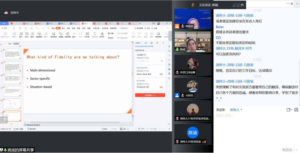 姚斌教授主要介绍了三个方面的内容,包括口译职业实践中常见的伦理挑战、口译职业道德准则与实践之间的差异以及口译实践中应对伦理挑战的策略。首先,姚教授通过一段今年两会记者招待会口译视频片段引出“伦理挑战”的主题,又通过一系列准则定位口译实践中的“忠实性问题”,然后采用案例教学法,运用大量的事例引导学生讨论问题的解决方案。其次,姚教授分析了这些伦理挑战所产生的核心原因,即口译生态系统中不同对象意图之间的矛盾,包括主办方和发言人之间的意图矛盾、发言人和听众之间的意图矛盾以及译员的职业声誉和主办方之间的意图矛盾等等。此外,姚教授还总结道,我们所讨论的“忠实性”是多维的、灵活的,需要针对具体的行业和情境去分析,他建议大家要学会预判情境,多思考、多分析,通过大量的案例来思考各种可能性,并不断积累实践经验,如此才能在遇到伦理挑战时权衡好利弊,迅速做出应对。