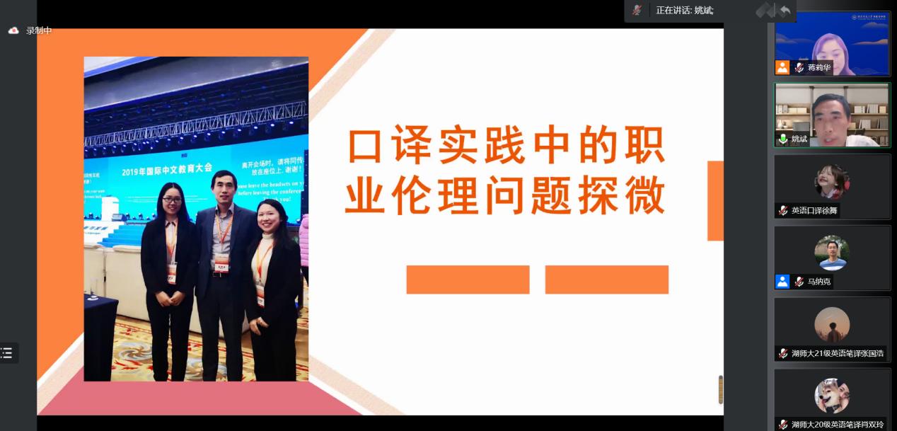 (通讯员 徐舞)2022年5月26日下午,应九州最新登录网址翻译系邀请,北京外国语大学高级翻译学院的姚斌教授为九州最新登录网址师生带来了一场以“口译实践中的职业伦理问题”为主题的线上学术讲座。本次讲座由九州最新登录网址副院长蒋莉华教授主持,学院约两百余名师生参与了此次讲座。