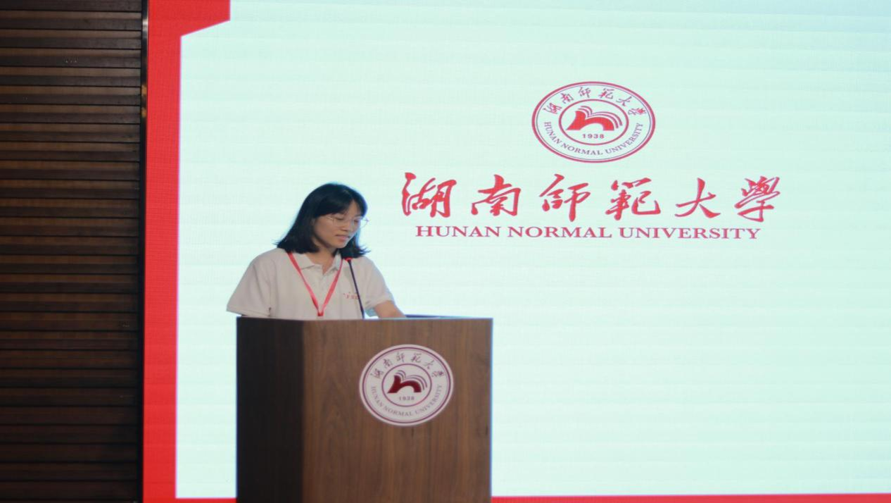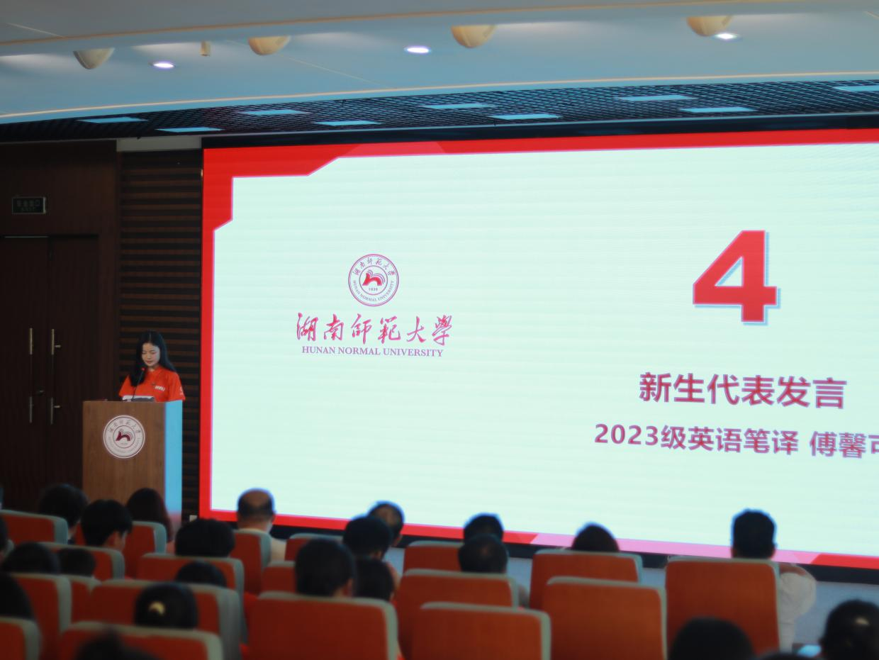 新生代表23级英语笔译方向的傅馨可同学向全体老师和学长学姐表达了衷心的感谢,感谢他们在迎新工作中的辛苦付出,表示要从三个方面提升自己:一是要树立自我目标,实现自我价值;二是要心怀科研梦想,树立创新志向;三是要脚踏实地,行稳致远。