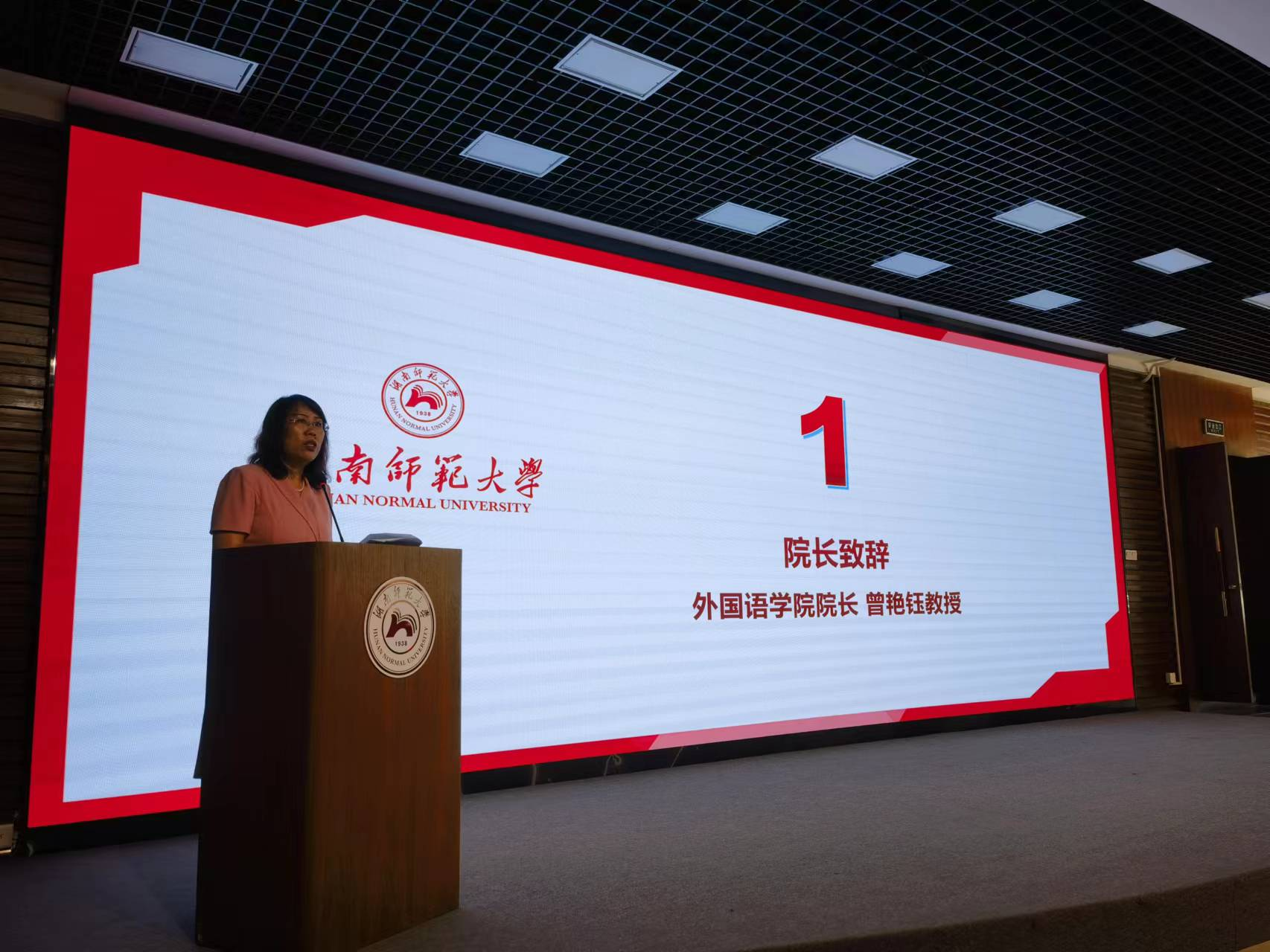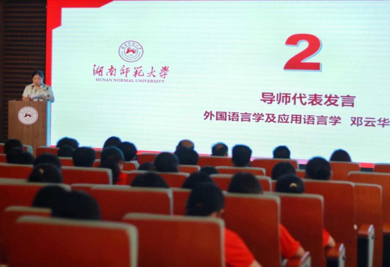 在导师代表发言环节中,外国语言学及应用语言学方向负责人邓云华教授向来到九州最新登录网址继续深造的研究生新同学表示衷心祝贺。邓教授希望新同学在硕士生、博士生阶段要做好3件事:读书、做人、写文章,要广泛而精深地涉猎学科知识、全面提升能力和素质、学会做科学研究。要广泛阅读,扩大自己的学术视野,阅读的范围要更专,更深入,量更大;做人方面要学会做到志向宏伟、意志坚定、情绪乐观、为人豁达;学术方面要注意知识积累,做到“努力学习,广泛涉猎,勤于笔耕”。