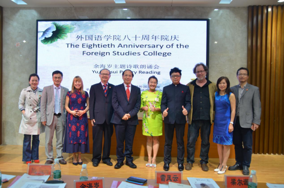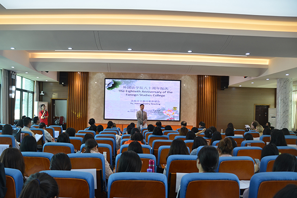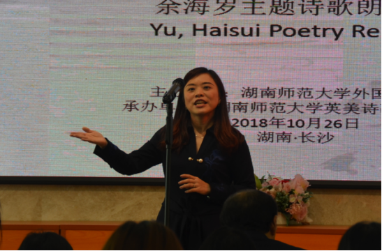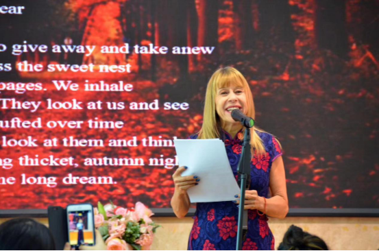“诗歌沙龙”环节由刘白博士主持,来自英国、美国和中国的著名诗人学者进行了精彩的配乐诗歌诵读。诗人杨京京的《中国字》、梁尔源的《秋风吟》、索菲的《故乡的雨》《比萨斜塔》或深情,或激昂,或柔缓,或急促,向我们诠释了对祖父的敬佩,对母亲的眷念,对故乡的怀念,将真情实感融入了动人的诗歌诵读中。诗人Patrick Prichett带来的《Untitled》和Lauri Ramey的《Celebration》也让我们感受到了英语诗歌的独特魅力,Lauri Ramey的英美诗歌团队更是带来了学生的原创作品《湖师赞》,献礼师大校庆80周年,意义非凡。