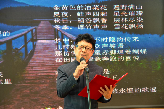 随后英国利兹大学常务副校长、英国皇家工程院院士、诗人余海岁朗诵了自己的作品《母亲》,伴随着柔美的音乐,他向我们缓缓地展示了一位慈母独立斜阳,深情款款地目送游子远走异邦的形象,饱含热泪,情真意切。